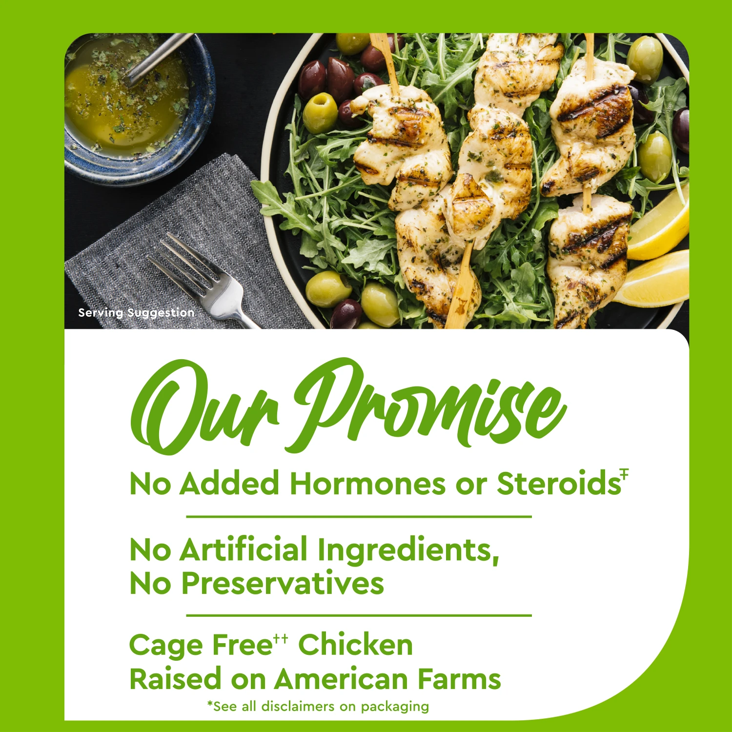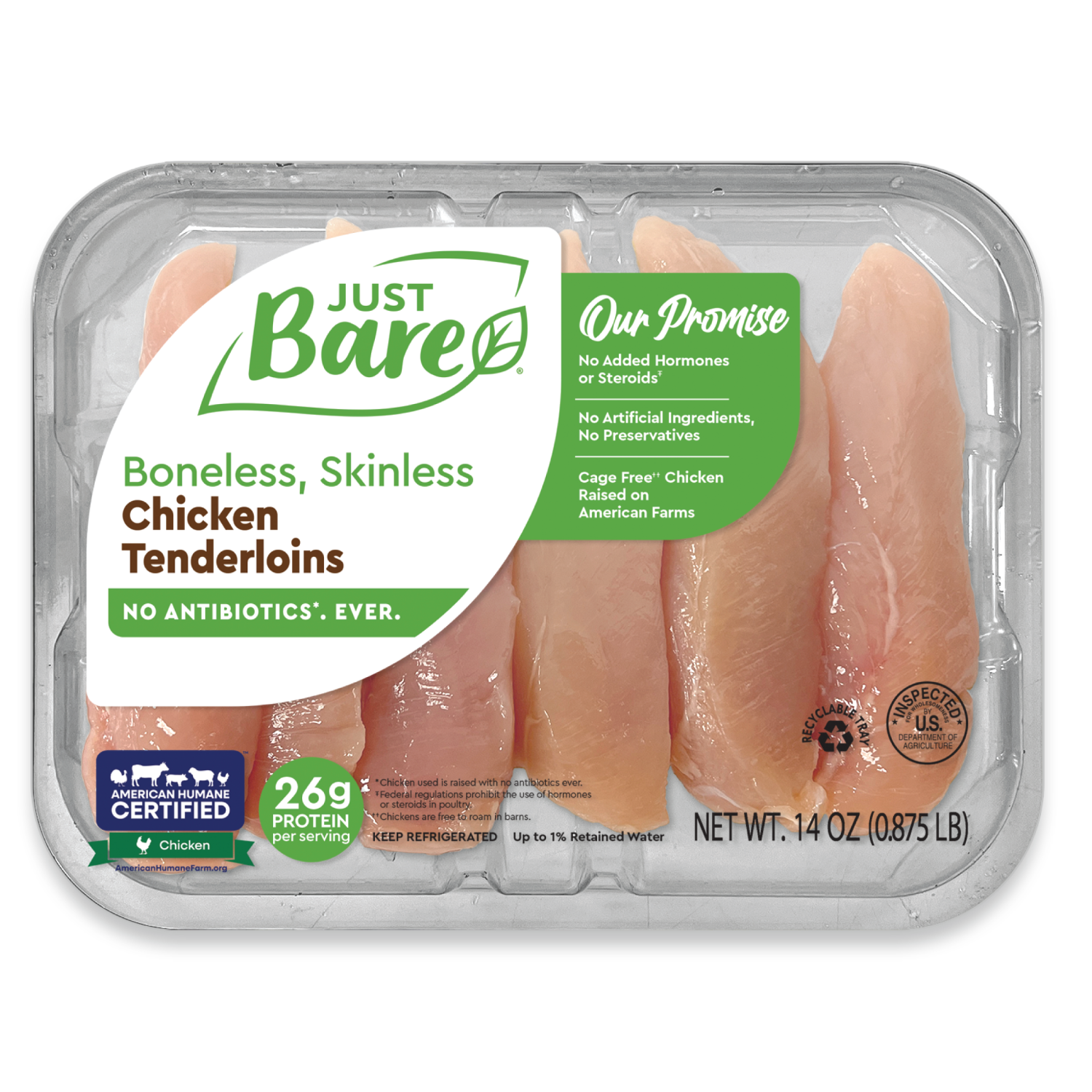 Our boneless, skinless chicken breast tenderloins are perfect for when you need to get dinner on the table in a flash! Great for stir-fries, fajitas, wraps and more. As always, Just Bare® provides chicken that features no antibiotics, ever*. Has no added hormones or steroids†. Uses no artificial ingredients or preservatives and uses chickens raised cage free on American farms‡.