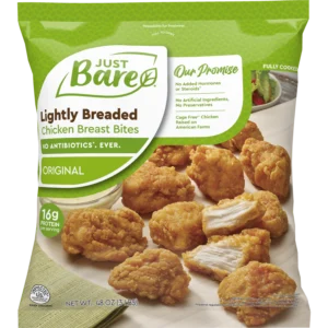 Our frozen, fully cooked Lightly Breaded Chicken Breast Original Bites are made with boneless chicken breast to make a wholesome finger food that is crispy, juicy, and flavorful. These Chicken Breast Bites are perfect on a salad, a mini slider, or on their own! As always, JustBare® provides chicken that features no antibiotics, ever*. Has no added hormones or steroids†. Uses no artificial ingredients or preservatives and uses chickens raised cage free on American farms‡.