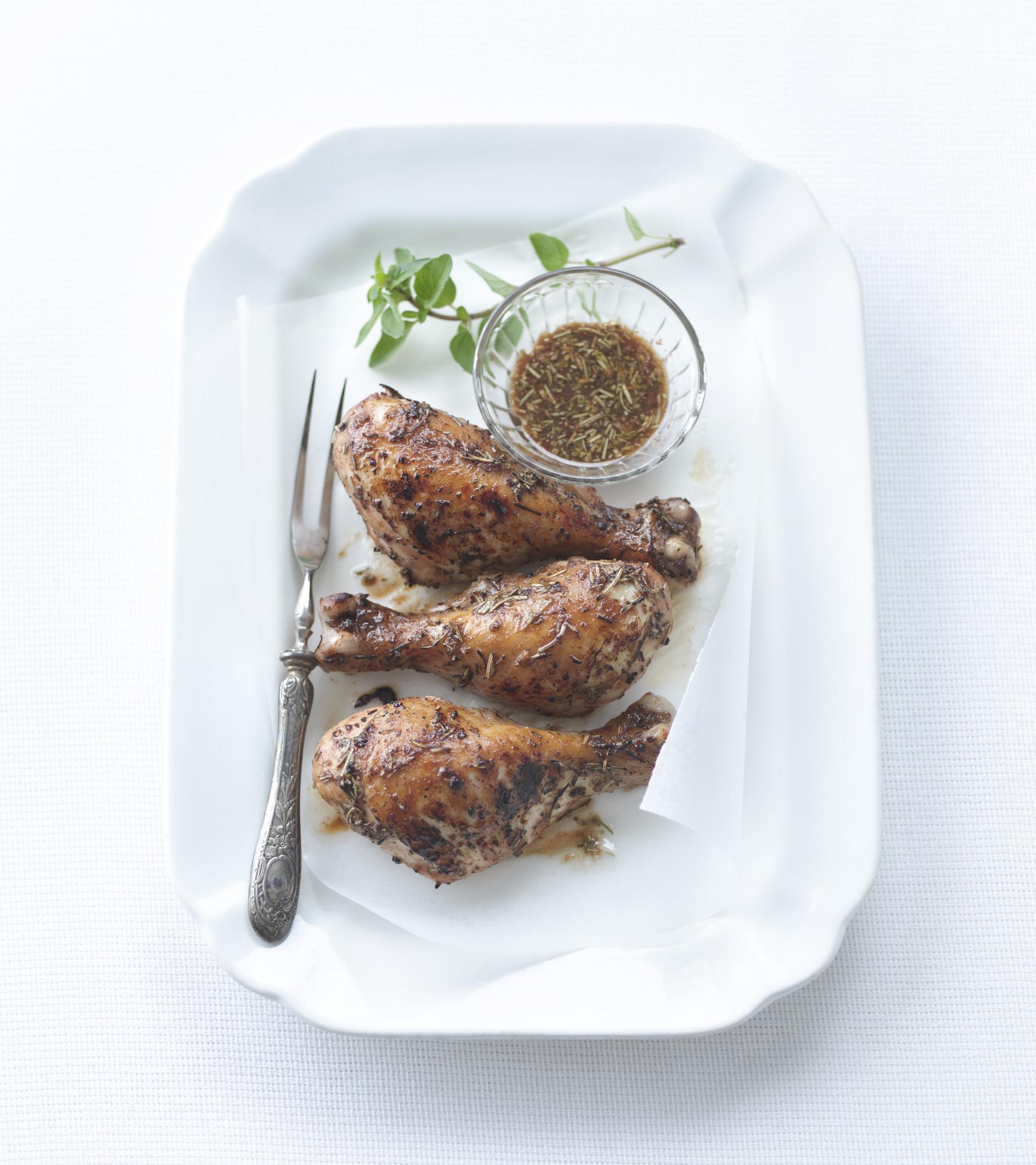 Marinating chicken drumsticks or thighs in a balsamic vinegar-olive oil dressing spiked with rosemary and oregano is quick and delicious—and can be started the night before or earlier in the day.