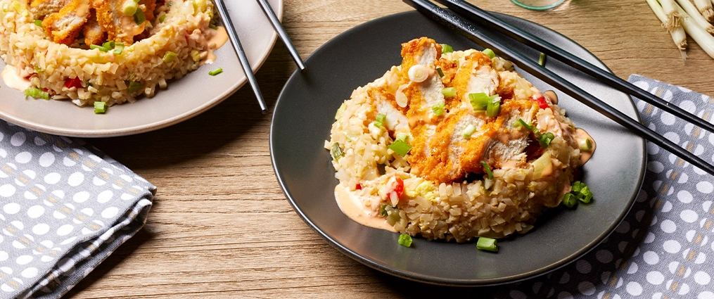 - Place cauliflower rice in the middle of plate, top with sliced crispy chicken breasts and drizzle with Bang Bang Sauce