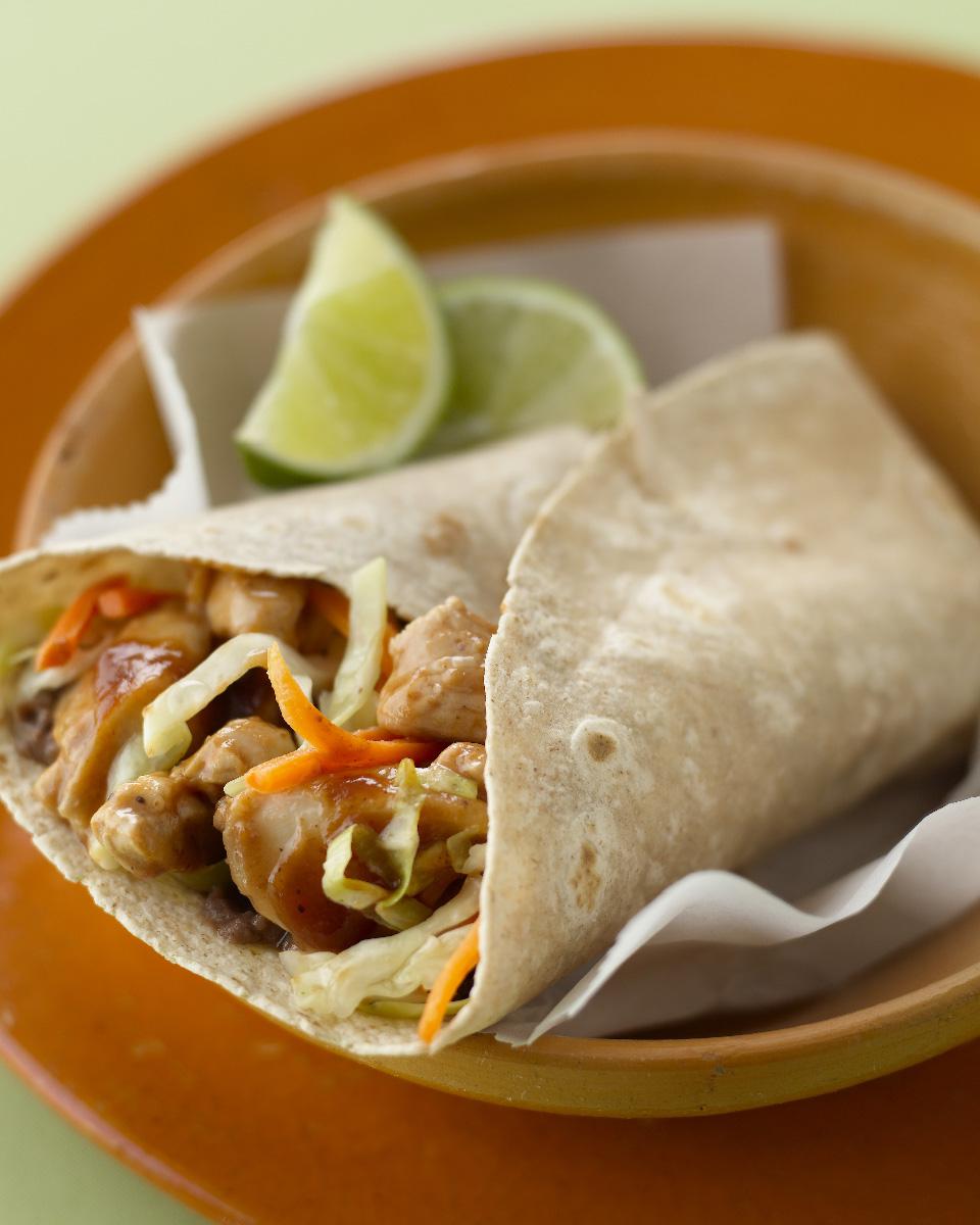 It’s easy to quickly sauté the chicken and veggie filling ahead of time for these hearty burritos—or use leftover shredded chicken, tossed with the barbecue sauce. Then just spoon in crunchy cabbage and shredded carrot with the rest of the filling.