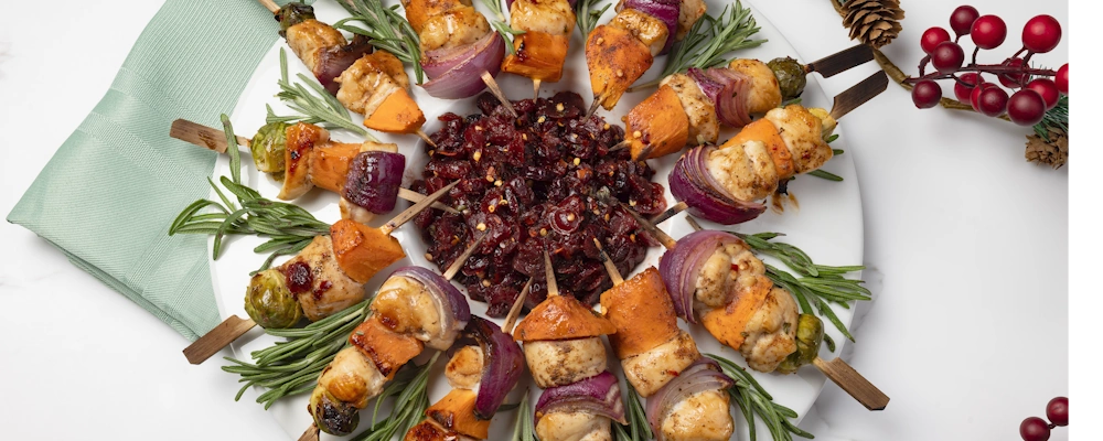 Elevate your appetizer game with this Chicken Brochette recipe. This crowd-pleaser combines juicy Just Bare Chicken Breast Tenders with sweet potatoes, brussel sprouts, and a zesty cranberry glaze.