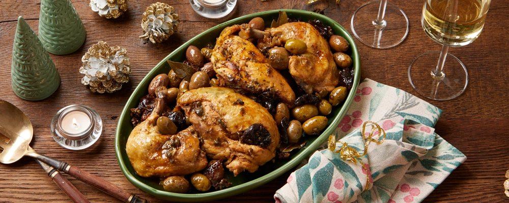 - Remove from the oven: The chicken should be ready when its internal temperature reaches 165°F, and the skin has achieved a golden brown hue. Transfer the chicken to a large serving platter, and top it with the prunes, olives, and capers.