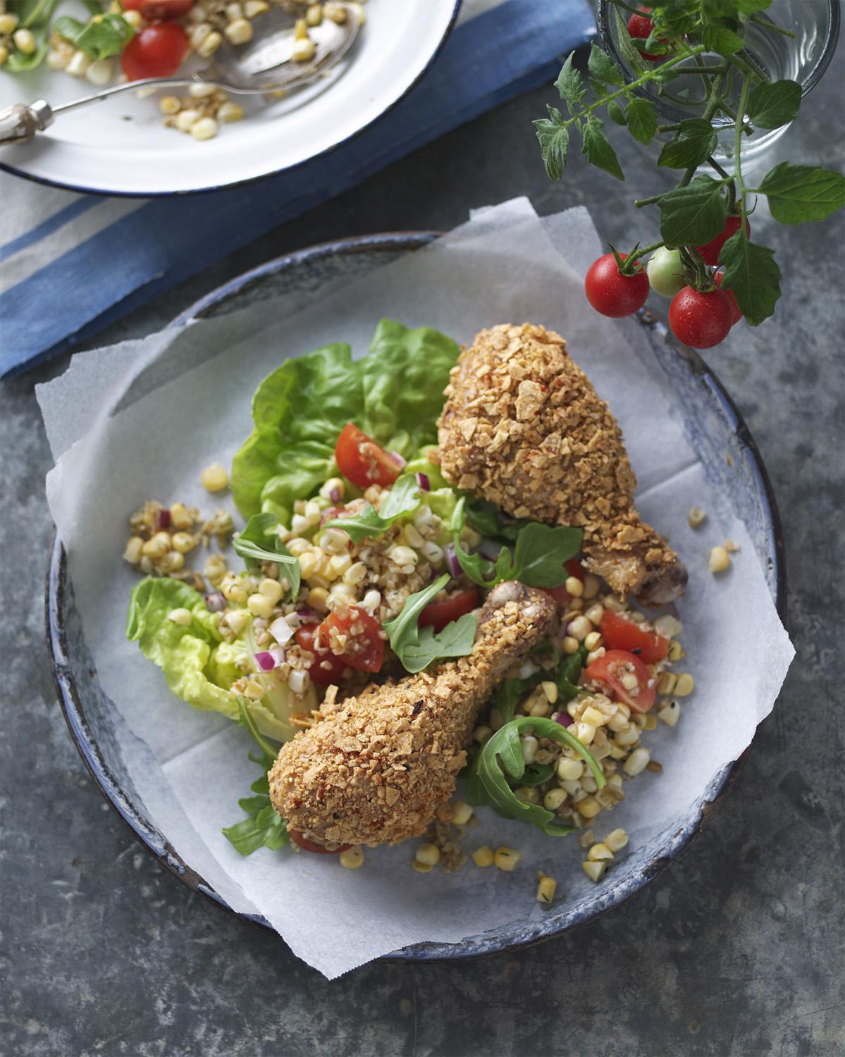 Crispy Drumsticks with Fresh Corn Salad