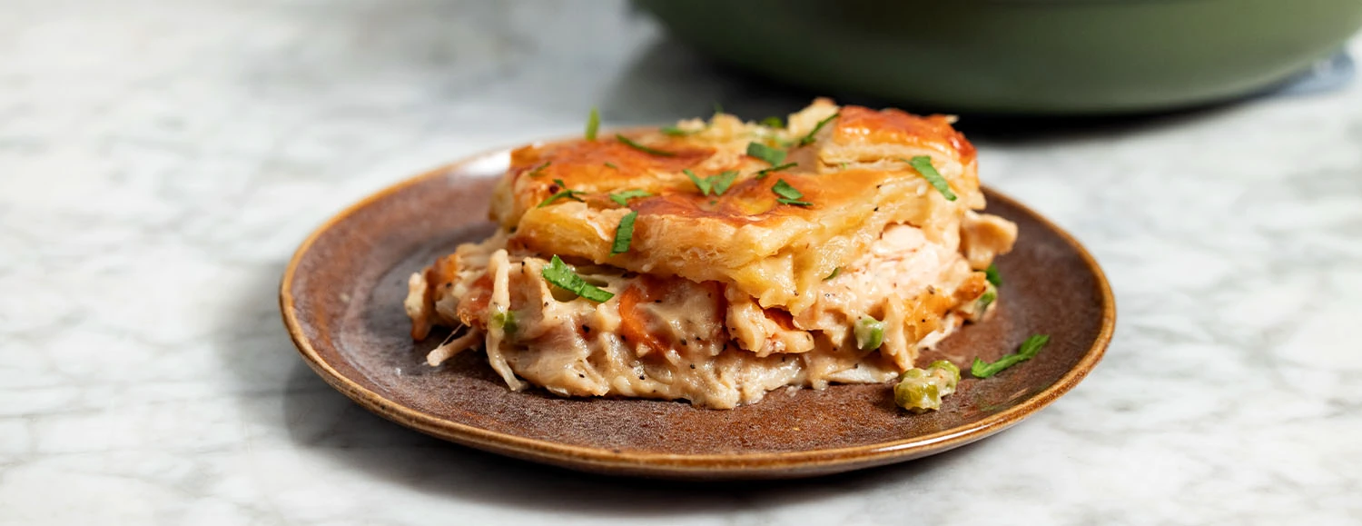 - Roll out one pastry sheet into a 16-inch square on a lightly floured surface. Cut into 2 inch small squares. Place the squares, slightly overlapping, on top of the chicken mixture.