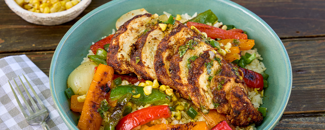 5. Remove all items from the grill and cut the grilled corn kernels off the cob. Begin assembling the bowl by adding rice, grilled vegetables, corn, sliced chicken and diced jalapeños. Top it off with the cilantro lime vinaigrette and serve!
