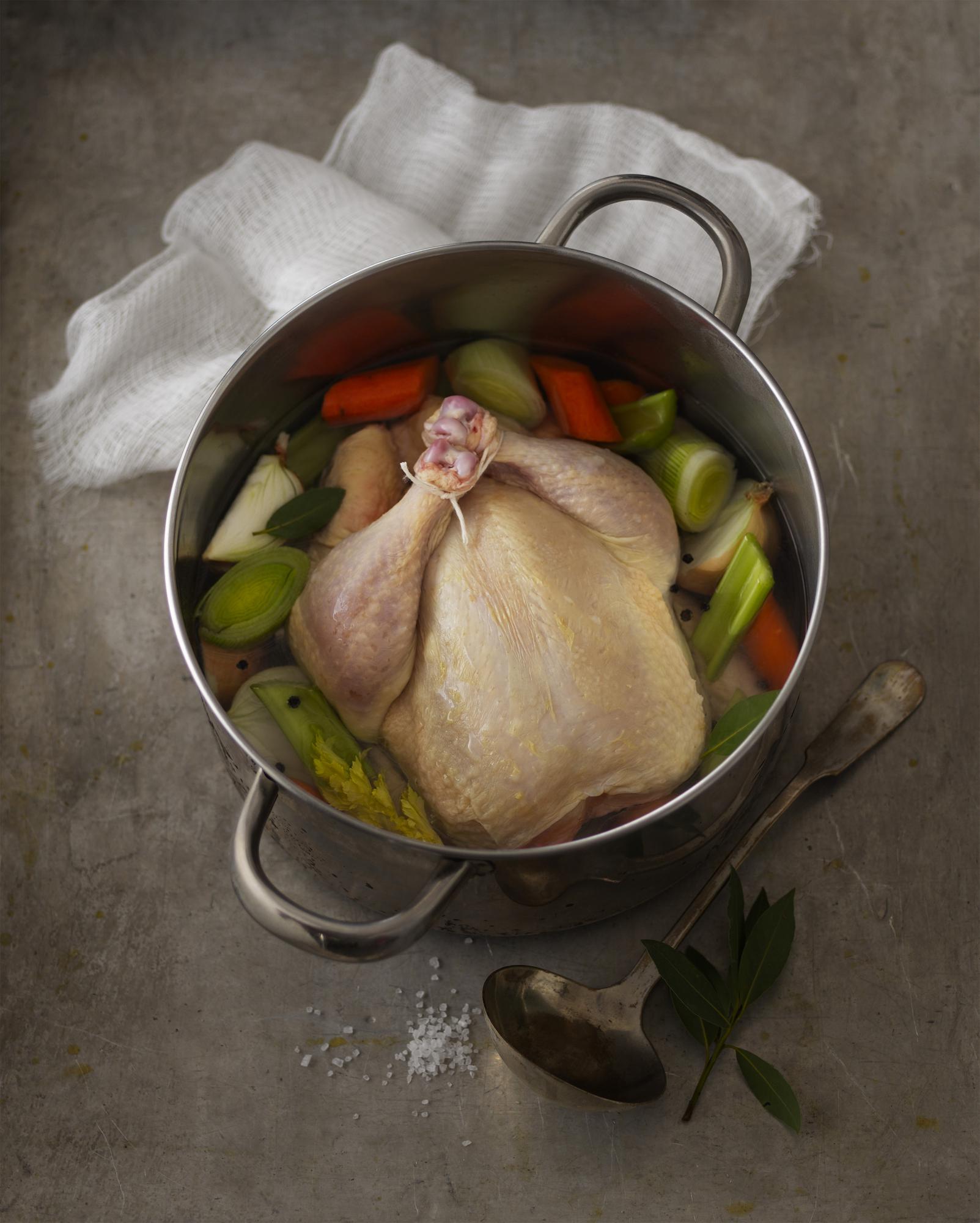 - Add chicken and remaining broth ingredients to pot, along with bouquet garni. Reduce heat to low, cover, and slowly heat until liquid is simmering (just below boiling). Uncover; skim foam off surface as it rises to the top. Simmer 35 minutes or until chicken is cooked through.
