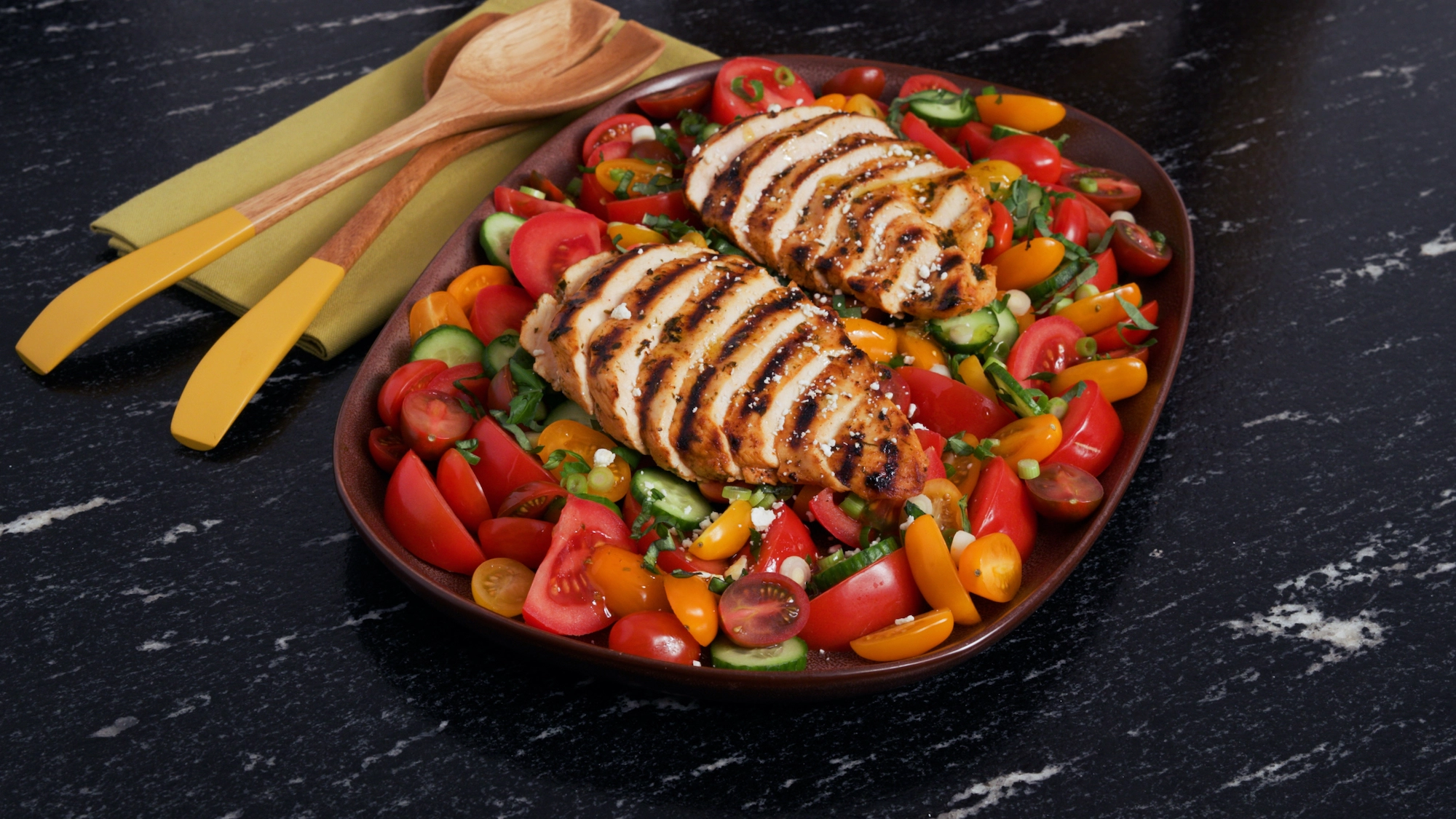 - While the chicken is marinating, prepare the tomato salad. Cut the tomatoes into thick slices – each slice can then be cut in half and arranged on a serving platter followed by the sliced cucumber and spring onion. Season the surface with a pinch of kosher salt and freshly cracked black pepper. Top the tomato salad with feta crumbles and sliced basil.