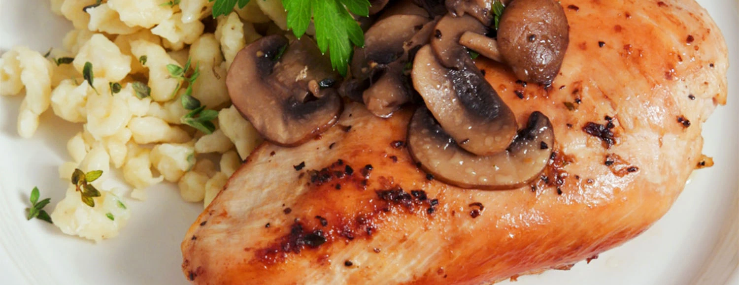 - Garnish your golden seared Just Bare® skinless boneless chicken breasts with the mushrooms and enjoy along with your spaetzle