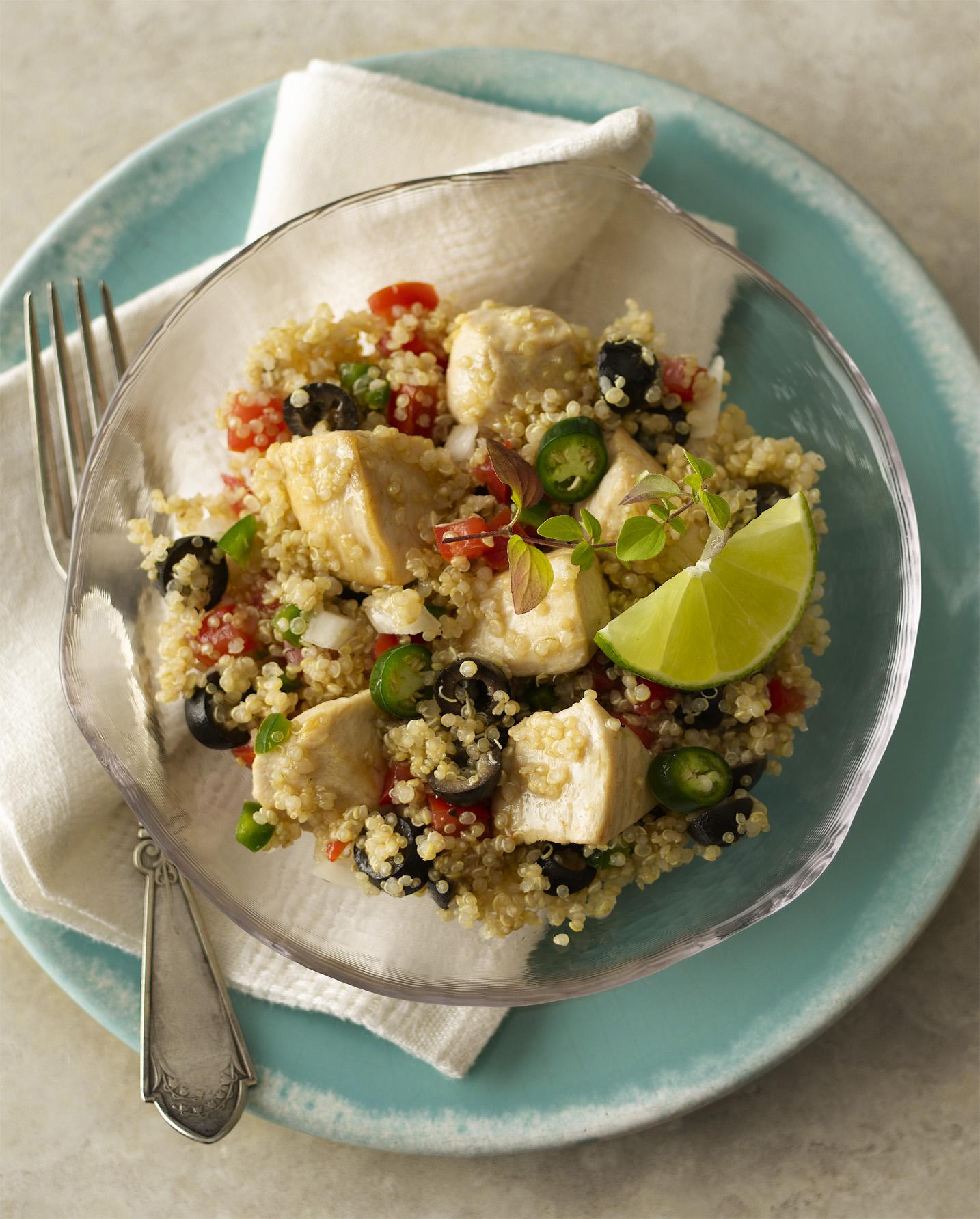 - Season chicken with 1/2 teaspoon salt and pepper. Heat 1 tablespoon oil in large skillet over medium-high heat. Cook, stirring occasionally, chicken 5 to 7 minutes or until no longer pink in center and internal temp reaches 165°. Pour into a large salad bowl. Add quinoa, pico de gallo, and black olives; gently stir until combined.