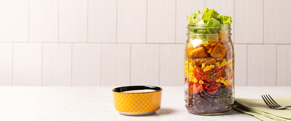 - Layer the ingredients in each jar: Add the black beans, cherry tomatoes, corn, cooked chicken bites, and bell peppers. If adding dressing, add first into base of the jar.