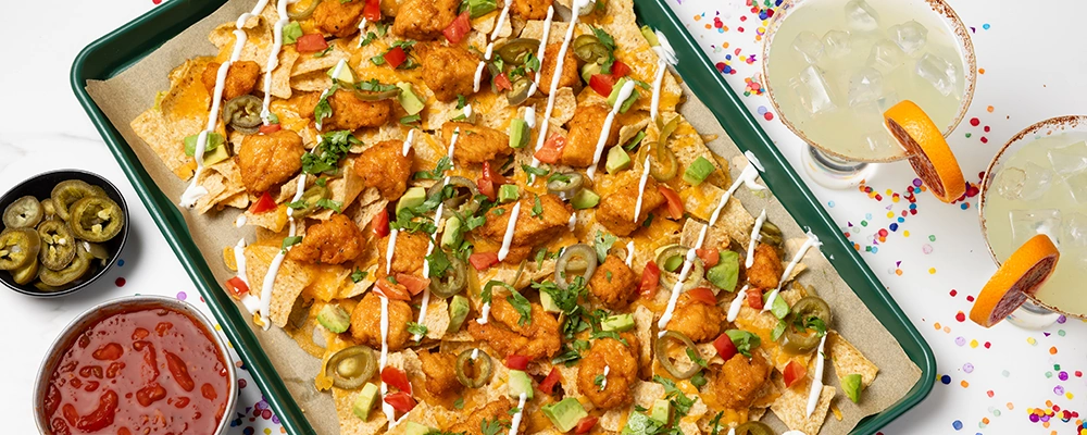 - Other Preparation: Preheat oven to 350 degrees. Pile tortilla chips on a baking sheet. Add hot and crispy Just Bare® Lightly Breaded Spicy Bites. Sprinkle cheese over the top and place in the oven. Bake for 4-6 minutes, or until cheese has melted. Top with sour cream, diced avocado, pickled jalapenos, salsa and chopped cilantro