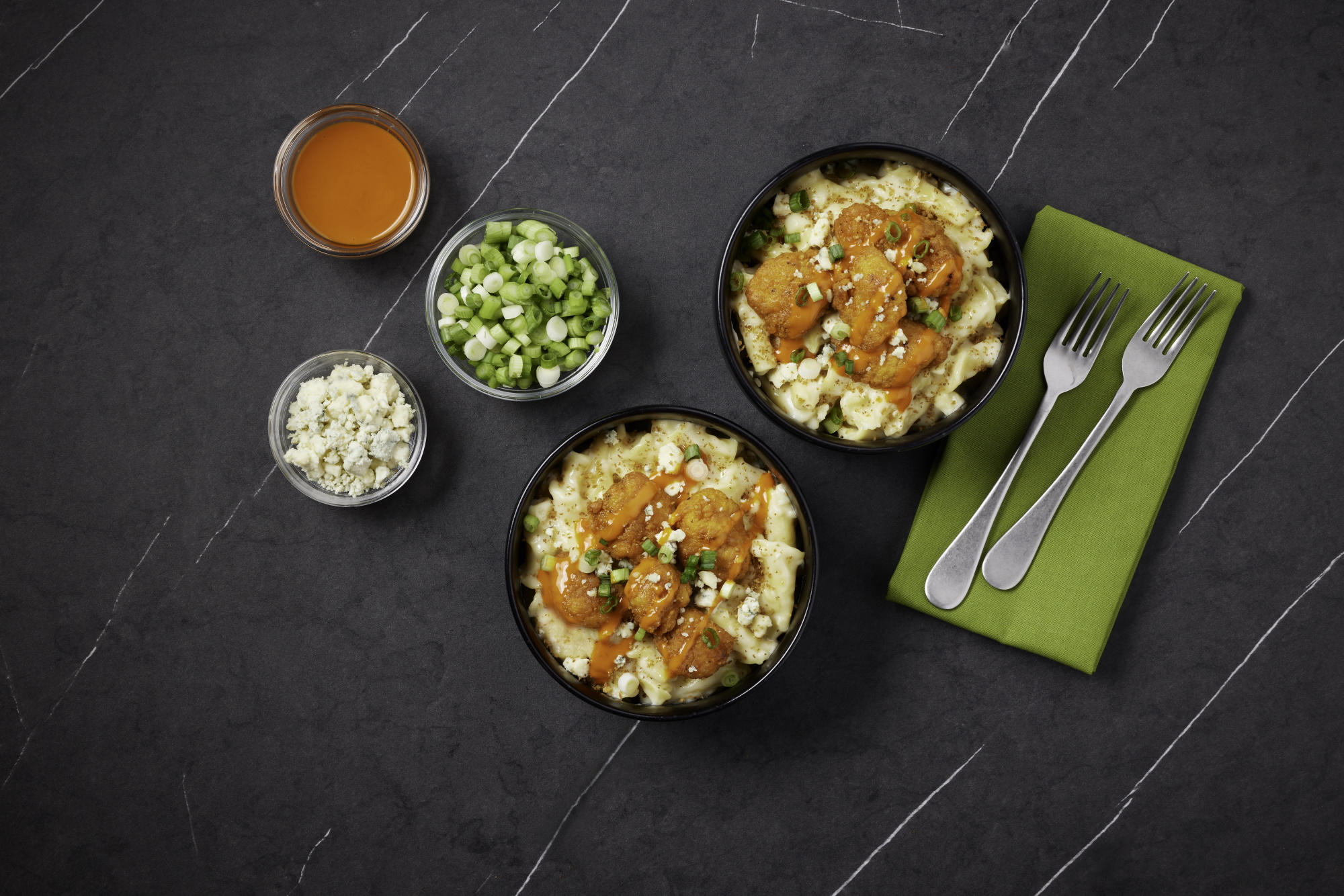 A creamy and spicy buffalo mac and cheese with Just Bare Lightly Breaded Chicken Bites, Buffalo sauce, and bleu cheese. The panko breadcrumbs offer a crunchy texture which contrasts with the creamy aged cheddar cheese sauce.