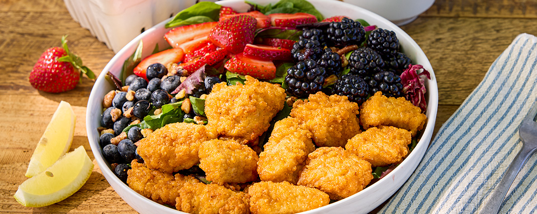 Sweet. Savory. Satisfying. This salad brings the best of summer into one vibrant bowl. Juicy strawberries and blueberries team up with crispy Just Bare Lightly Breaded Chicken Breast Bites, tangy goat cheese, and candied pecans – all layered over mixed greens. A homemade strawberry vinaigrette ties it all together with a fresh, fruity finish.